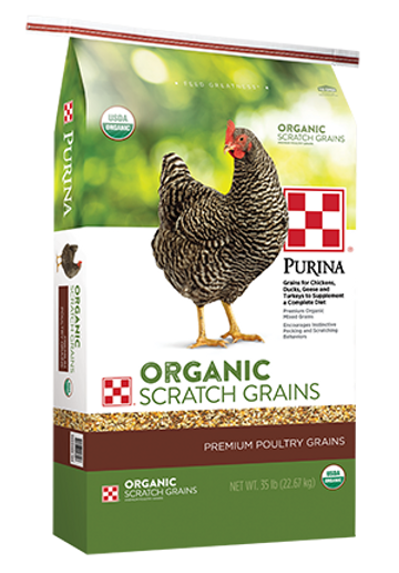 Purina® Organic Scratch is a blend of high-quality grains to complement complete feeds and encourage natural pecking, foraging and feeding instincts. They are certified USDA Organic for use with organic flocks. Purina® Organic Scratch Grains are recommended for organic flocks that include adult chickens, ducks, geese and turkeys – as a treat to complement their complete feed.